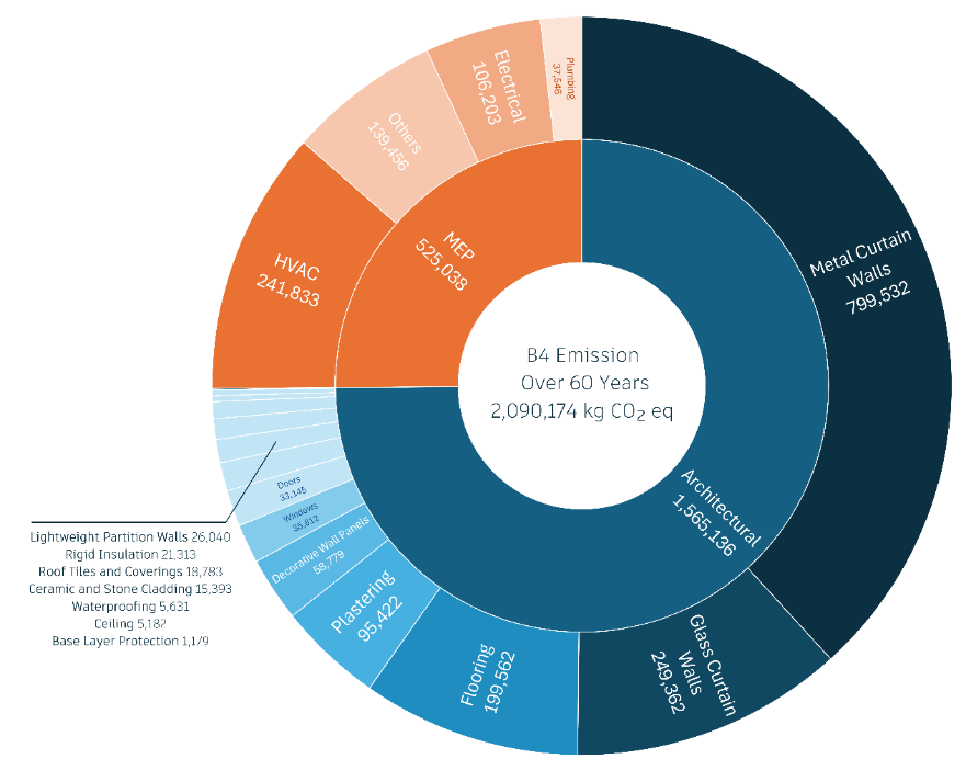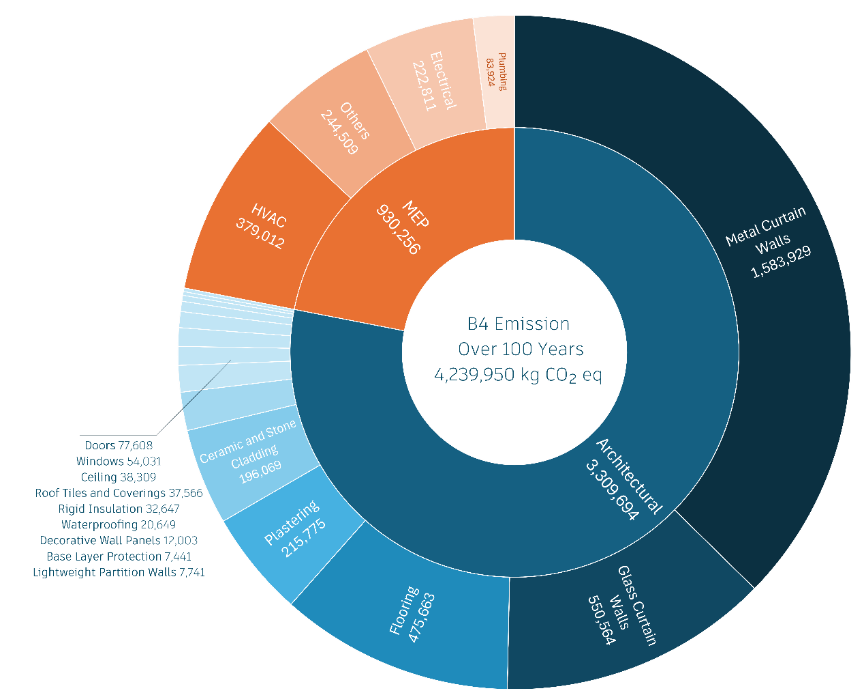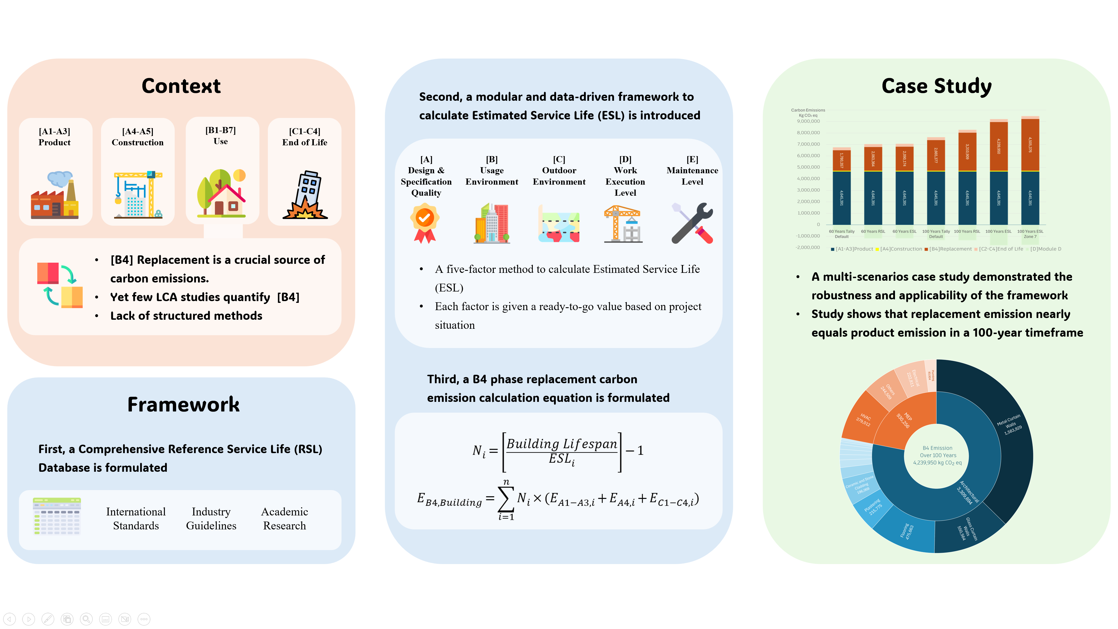 发表论文针对传统生命周期评价(LCA)研究中较少关注,但在长期运营中可能累积显着碳排放的 “构件更换阶段”(即 B4 阶段)开展系统研究。在当前主流标准与文献中,B4 阶段常因缺乏统一、清晰的计算方法而被简化或忽略。论文研究提出了一种模块化的框架,将构件生产、运输、安装、拆除与回收五个环节纳入模型,并引入参考寿命(RSL)与估算寿命(ESL)概念,通过五因子“引导法”减弱主观估计的不确定性,使更换阶段的碳排放可计算、可比较、可推广。以一个住宅建筑案例为例,研究发现在 60 年寿命周期假设下,构件更换阶段累计排放约占初始生产阶段排放的45%;若延展至 100 年寿命周期,构件更换产生的碳排放量几乎可与初始生产排放量相匹敌。研究还指出,金属幕墙和机电系统(MEP)是更换阶段的排放热点,凸显在长期运行中短寿命组件和高碳强度构件的重要性。