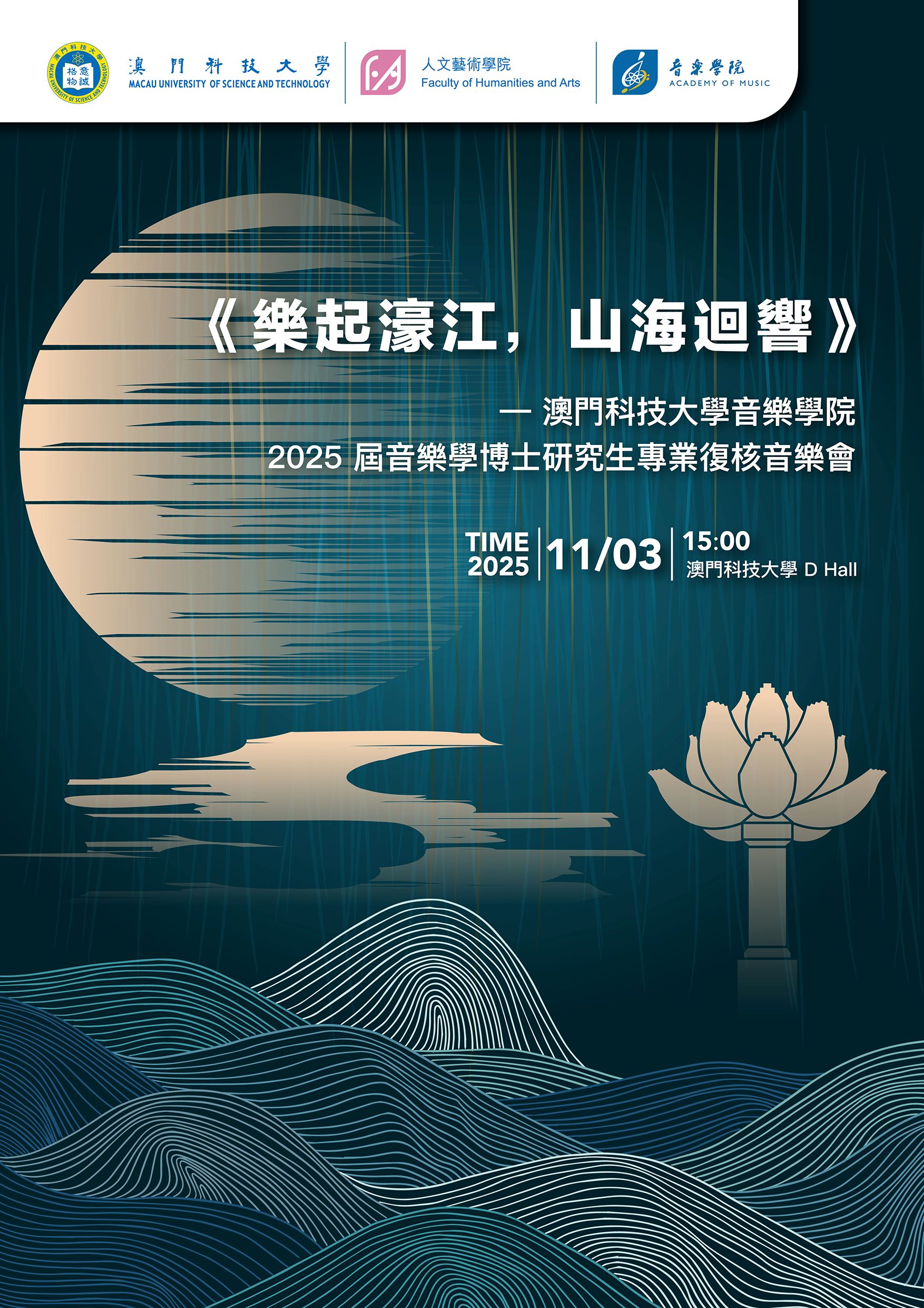 《乐起濠江 山海回响——澳门科技大学音乐学院2025音乐学博士研究生专业复核音乐会》,于2025年11月3日下午在大学D Hall举行。本场音乐会带来了多首中国传统音乐的新编与创意之作,以钢琴、声乐及民族室内乐等丰富形式,奏响了古今交融的华美乐章,展现了中华音乐文化的深厚底蕴与时代活力。