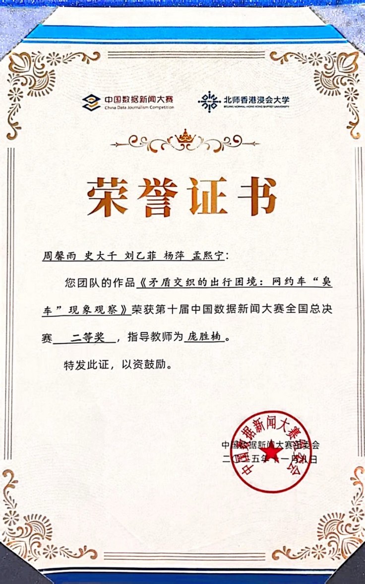 2025年11月8日,第十屆中國資料新聞大賽暨首屆AIGC應用大賽決賽在珠海北師香港浸會大學圓滿落幕。澳門科技大學人文藝術學院新聞傳播專業畢業生周馨雨、劉乙菲、史大千、孟熙甯、楊萍的資料新聞作品《矛盾交織的出行困境:網約車"臭車"現象觀察》榮獲全國總決賽二等獎,龐勝楠副教授擔任該作品指導老師。