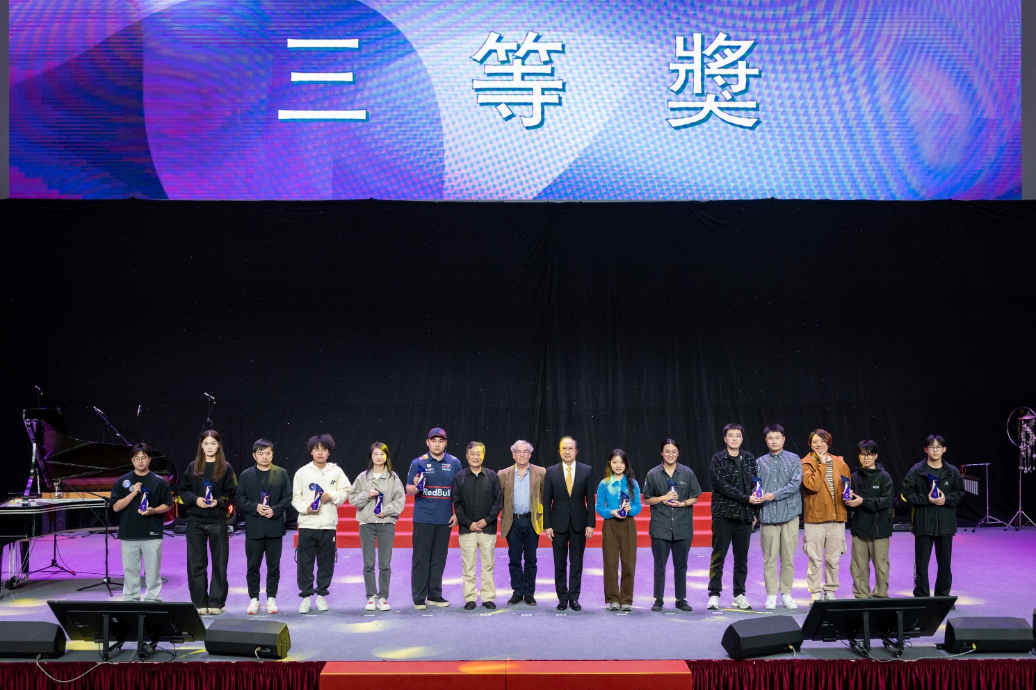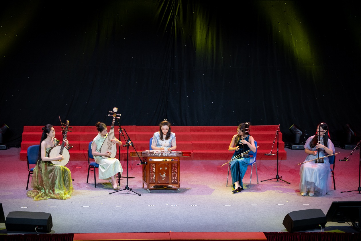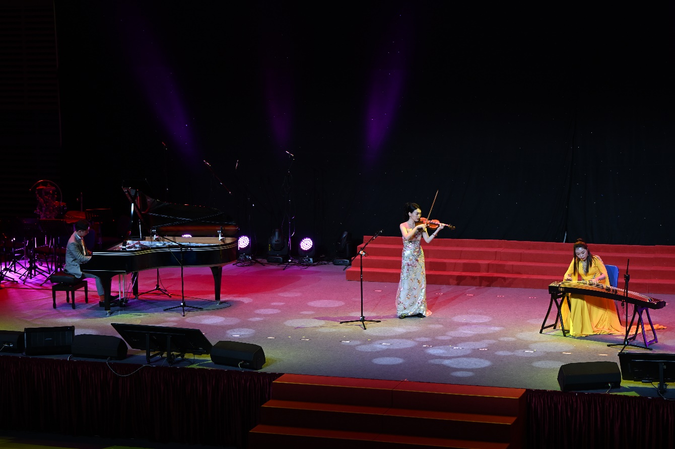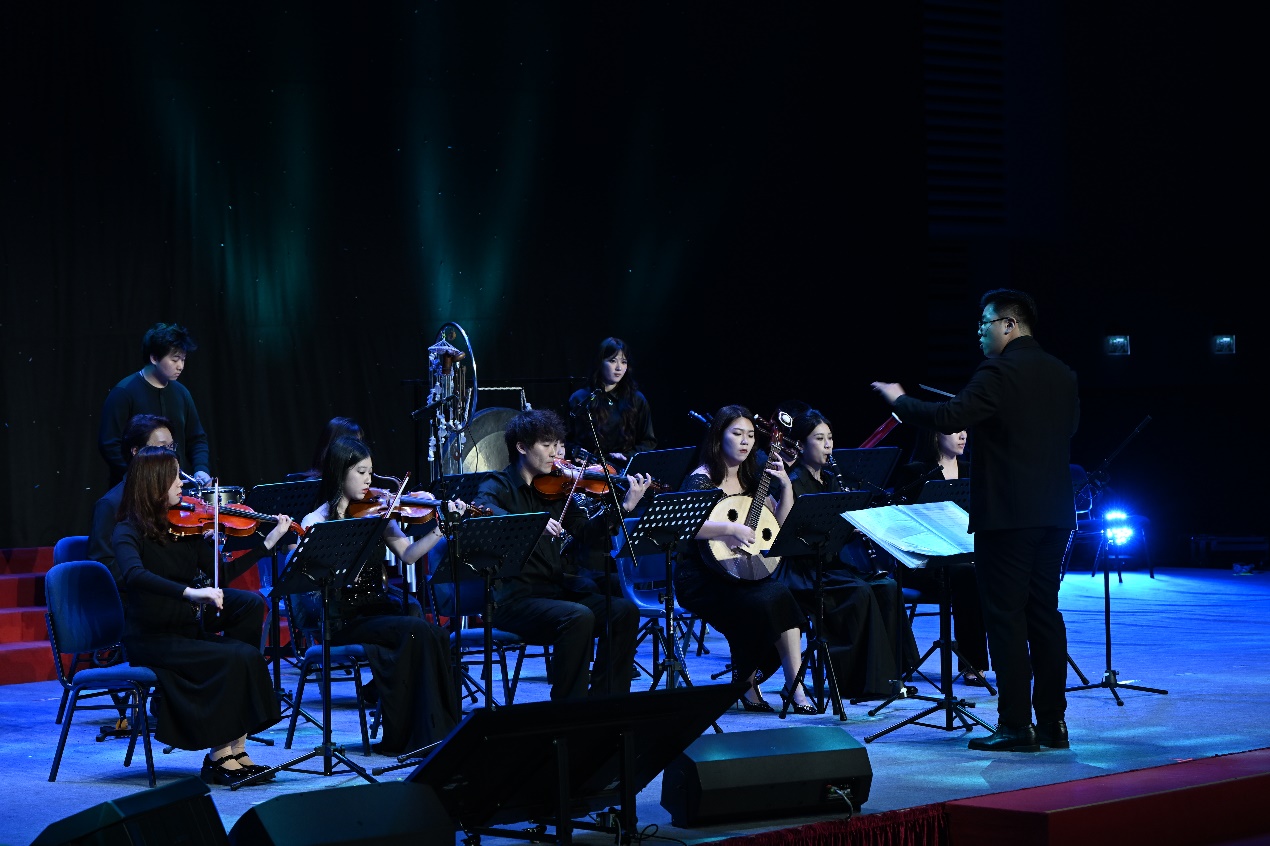 頒獎儀式結束後的音樂會將現場氣氛推向高潮,充分展現了音樂學院扎實的教學成果與師生協作的高水平演奏。整場演出匯集傳統經典改編與原創新作並蓄的數智融合曲目,以技術賦能藝術表達,展現多元創作維度。演出從《梁山伯與祝英台》拉開帷幕,由音樂學院學生曹芳菱、孔繁樂、梁文尊(2024 級博士生)演繹。作品融合越劇曲調與西洋交響技法,成為民族與西洋音樂跨界典範;緊接而來的《新賽馬》節奏鮮明、氣勢奔放,由王佳佳、黃奕婷、薛澍、樊嘉琳及潘天舒(2025級博士生)聯合呈現,再現駿馬飛馳的熱烈場景。隨後上演的原創室內樂作品《風起海上》由劉宇騰同學(2024 級碩士研究生)創作,以「啟航」為核心意象,營造出揚帆破浪的壯闊意境,彰顯學院「教學、創作、演出」一體化的實踐精神;而由楊礫堯同學(2024 級碩士研究生)所改編的《茉莉花》則作為壓軸亮相出場 音樂融合古典與現代音樂語彙,傳遞澳門中西文化交融的地域特色,為演出畫上圓滿句號。