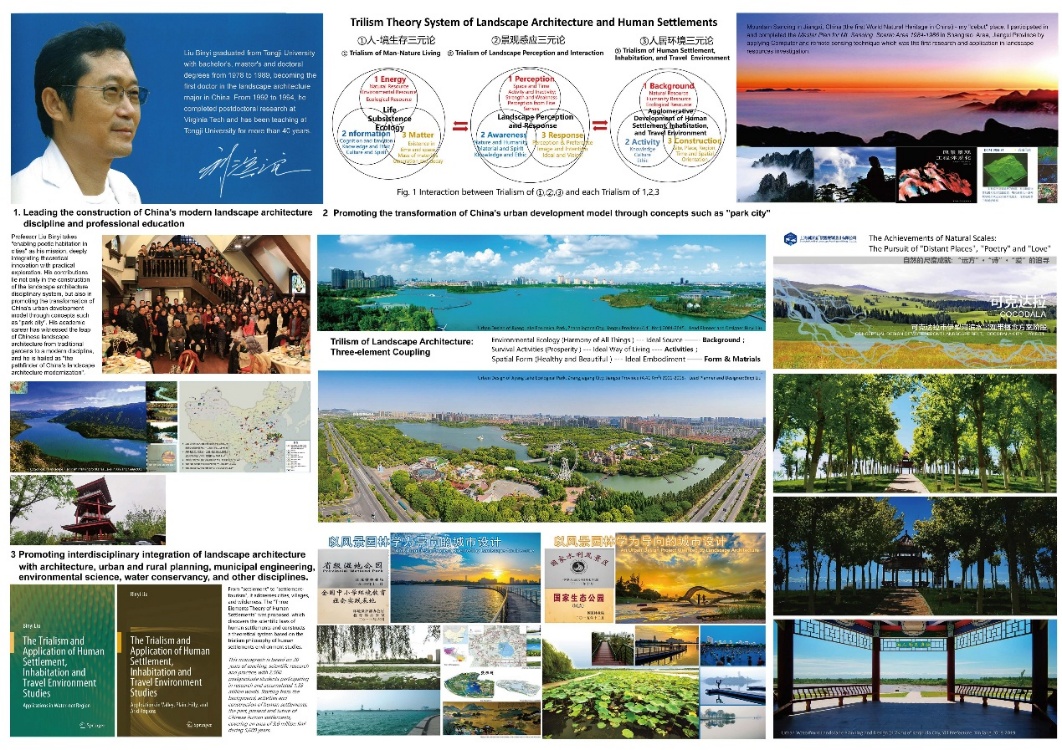1. 创立学科体系:2011 年,刘滨谊推动了中国风景园林学一级学科的建立。他连任两届国务院学位委员会风景园林学科评议组第一召集人 ,10 年完成了“三轴六向”的学科发展体系。