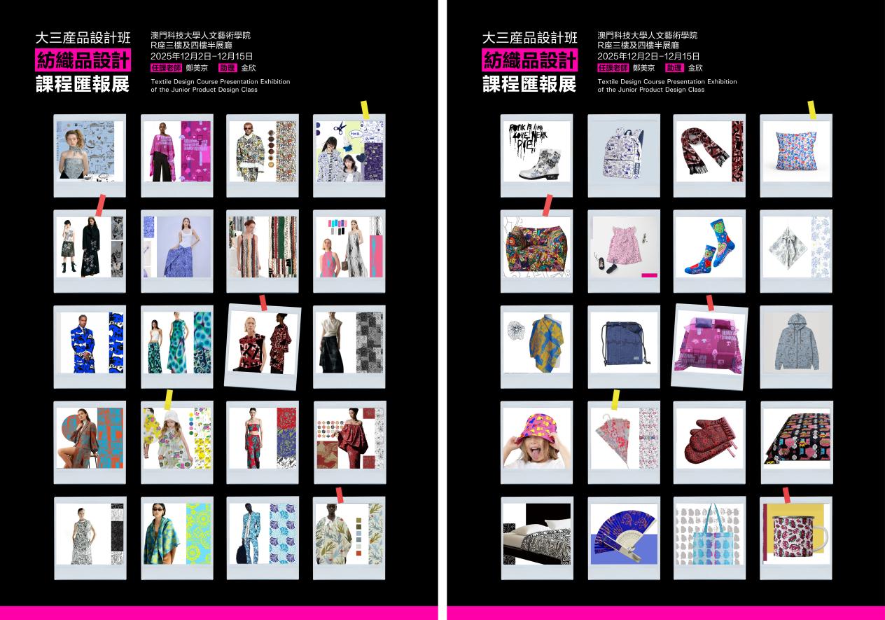 2025年12月2日,澳门科技大学人文艺术学院《纺织品设计科目汇报展》在学校R座三、四楼展厅成功举办。此次展览展示了产品设计三年级学生们在学习过程中所取得的创意与实践成果。该科目由郑美京教授担任主讲,历时近一个月的密集教学。该科目旨在让学生了解“纺织品设计”的基本概念以及其应用范畴,从对于不同工具与技术手段的了解与尝试,到运用不同工艺、技巧对图形纹样进行绘制与拼接,以及对于印刷面料的选择,完成从纹样设计到数码印刷面料成品打印,并将这些成果以综合性的手段应用于时尚设计项目,进行纺织品面料与设计载体相结合的思考,均是这个科目的学习内容。