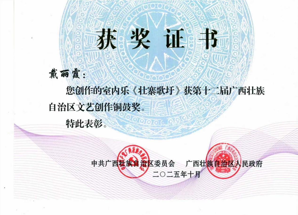 近日,第十二屆廣西壯族自治區文藝創作銅鼓獎揭曉。澳門科技大學音樂學院首屆博士生戴麗霞創作的室內樂作品《壯寨歌圩》榮獲音樂類銅鼓獎。該作品是在其博士研究生學習期間完成,由音樂學院院長鄭中教授擔任指導老師。本次評獎共頒發包括文學類、文藝理論評論類、音樂類、美術類、書法類等50項獲獎作品,其中音樂類銅鼓獎5項。