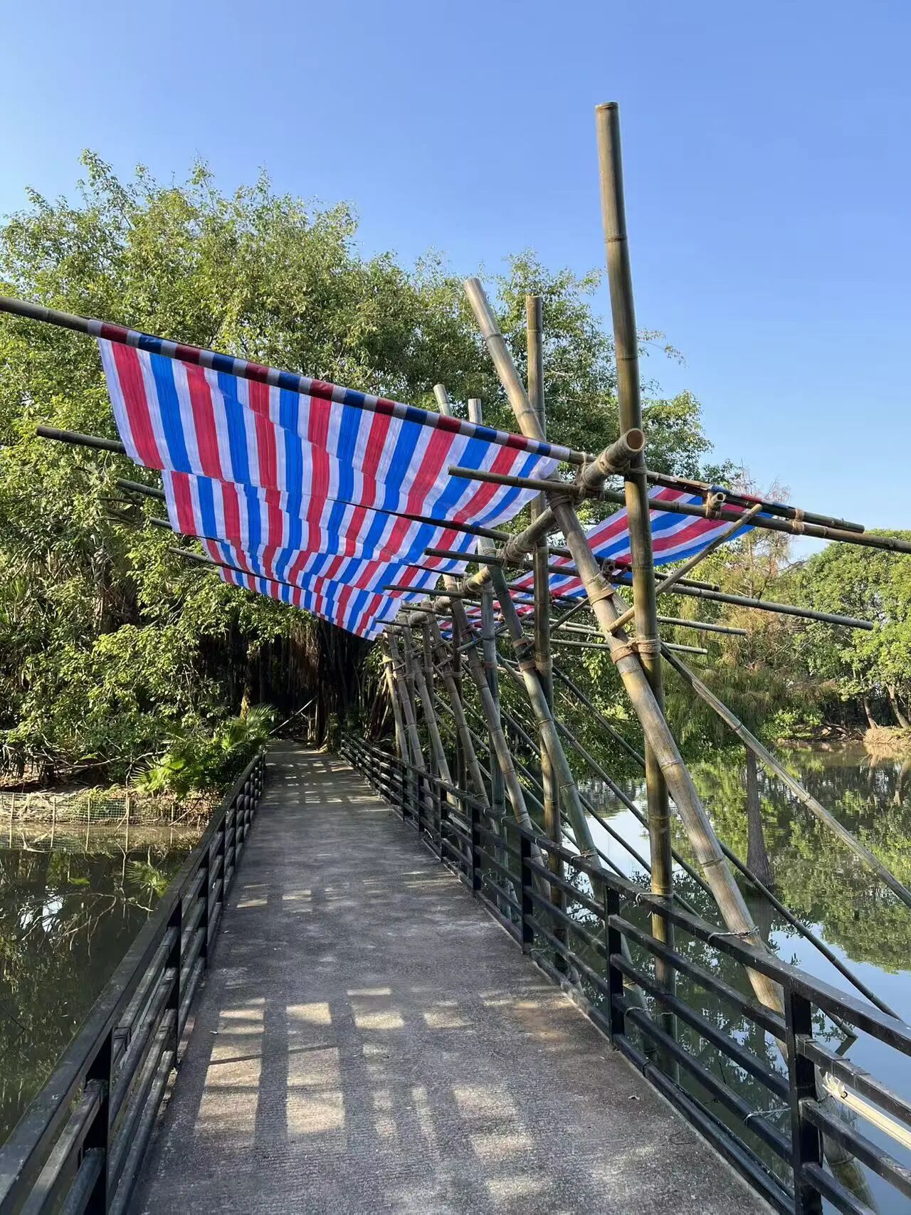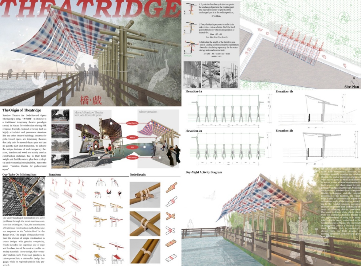 《桥戏Theatridge》以交通空间与休闲功能融合为核心,尝试对传统竹棚进行空间转译。其空间原型源自澳门雀仔园社区,当地曾搭建线性竹棚覆盖整条街道,既供演出使用,亦作通行空间。该设计借鉴传统竹棚的捆绑技法,充分发挥竹材的原生属性,为游客与动物在多变的气候条件下提供适应性遮蔽。同时,设计沿用了传统竹棚标志性的红蓝白三色塑料布,营造出深植于澳门本地记忆的空间氛围。最终,方案实现了低技术结构的弹性适应性,其内核与澳门神功戏竹棚所体现的在地智慧高度契合。