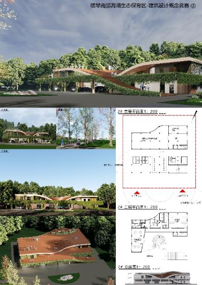 张天译团队的设计方案以生态完整性与低干预为首要原则,建筑顺应原有地形与植被格局,通过架空体量、点状落地与连续生态廊道的布局方式,最大限度减少对湿地生境与鸟类飞行通廊的干扰,保障潟湖生态系统的连续性与稳定性。朱广森团队的设计方案以“风浪栖羽”为意象,1号地块“风浪之核”为文化展示中心,以海浪曲线融入地景;2号地块“栖羽之核”为科研救护中心,形如飞鸟展翅。采用预制组装、垂直绿化、雨水收集与人工湿地闭环水系统,并运用鸟类友好玻璃与智慧调控技术,减少生态干扰。体现“隐逸共生”哲学,将绿色技术隐匿于诗意形态之中。沈凌睿团队的设计方案以 “藏”为体,以“环”为用。覆土建筑体现了对大地生态的最大谦逊,而拔高的圆环则象征着人类理性观察与生态关怀的轻盈姿态。不仅是功能的集合,更是一次关于隐匿与呈现、大地与天空、人类与候鸟的深层空间对话,旨在为横琴潟湖塑造一个真正具有示范意义的、融于环境的生命庇护所与科研教育基地。