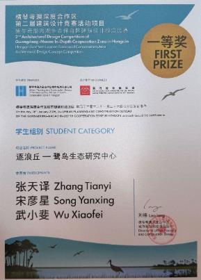由橫琴粵澳深度合作區城市規劃和建設局主辦、澳門建築師協會承辦的「橫琴粵澳深度合作區第二屆建築設計競賽活動項目——橫琴南部潟湖生態保育區建築設計(概念)比賽」頒獎儀式於2026年1月26日在橫琴文化藝術中心隆重舉行。本次大賽首次設立學生組別一等獎1組、優異獎2組,旨在鼓勵就讀建築系的大學生發揮創意。澳門科技大學建築學課程2025級碩士生張天譯、2025級博士生宋彥星及2025級博士生武小斐團隊作品“逐浪丘-鷺鳥生態研究中心”榮獲一等獎;2022級博士生朱廣森、2022級博士生宋海娜及2022級博士生賈孟炎團隊作品“風浪棲羽-生態綜合”,2024級碩士生沈凌睿、2024級碩士生李華潔及2024級碩士生帥涵宇團隊作品“藏形顯意-橫琴潟湖護飛與科研教育中心”榮獲優異獎。