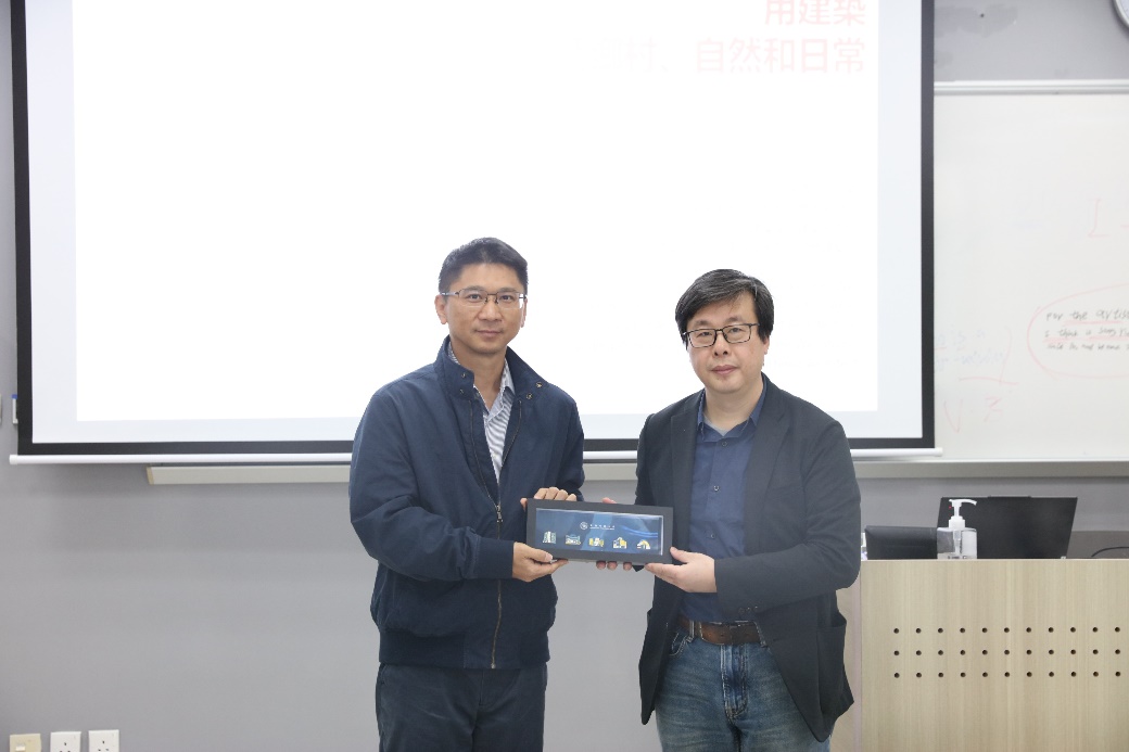 建筑学课程主任郑剑艺副教授(左)代表学院致赠纪念品给何崴教授(右)