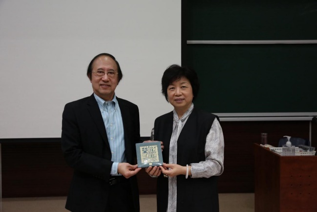 陳永華教授(左)向圖書館贈送專輯,並與鄭中院長(右)合影留念 |