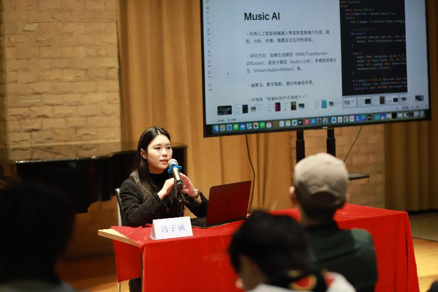 在「智繪樂韻·科藝融合」學術論壇中,兩校師生圍繞表演科學、音樂分析、音畫交互及作曲哲學等多維議題展開深入討論,通過數據分析、技術展示與創作分享,呈現跨學科研究的新成果。論壇由華師大音樂學院青年教師王思齊主持。在學術分享環節,華師大音樂學院徐越湘教授介紹了「自然而生」的作曲理念,探討技術、演奏難度與個性化表達的平衡;澳科大音樂學院謝昕博士從音樂表演科學出發,結合音樂表演焦慮實證研究,提出結合生理數據與虛擬現實的干預方向;音樂學院2024級博士生陳方圓運用音級集合與聲學軟件分析中提琴作品,揭示核心音集與民族色彩的结构統一機制;音樂學院2024級碩士生馮子函展示音畫交互創作實踐,說明聽覺與視覺的雙向互動及通感的實現方式。論壇期間,師生圍繞跨學科研究、技術應用與創作實踐展開熱烈討論,為音樂教育與創新實踐提供豐富啟發。