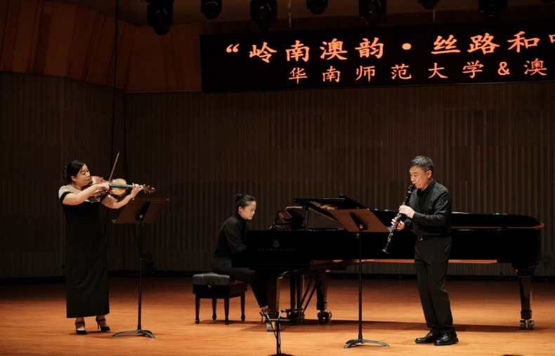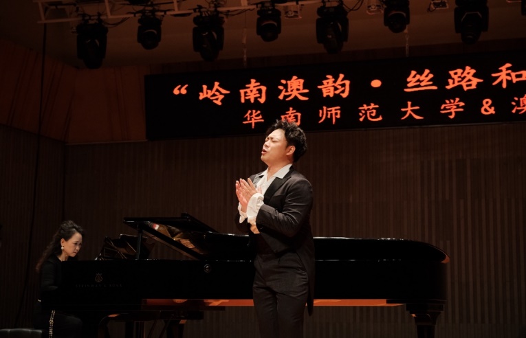 當晚,「嶺南澳韻·絲路和鳴」交流音樂會在華南師範大學音樂學院音樂廳圓滿舉行。兩校師生聯袂登台,以民樂、古箏、鋼琴、聲樂及室內樂等多元形式,呈現了一場融匯中西、貫通古今的音樂盛宴。尤為矚目的是,音樂會上演了多首由兩校師生原創的作品,生動展現青年音樂創作者在音樂創作中的創新意識與個性表達。民族音韻與西方經典交相輝映,個體技藝與集體協作相得益彰,既彰顯了紮實的專業功底,也折射出跨校合作的高度默契與藝術熱忱。壓軸曲目《我和我的祖國》由全體演出人員共同演繹,熟悉旋律迴蕩音樂廳,為整場交流音樂会畫上圓滿的句號。
