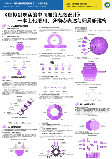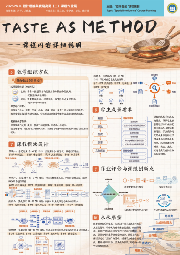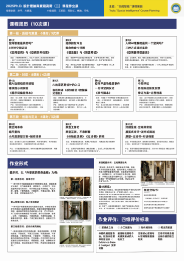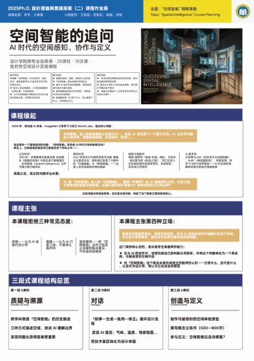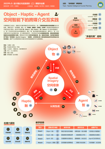 在人工智能深刻重构设计定义的时代背景下,博士研究生核心必修课《设计学理论与实践高阶(二)》开启了一场关于“空间智能”的深度思辨。本课程以李飞飞教授的“空间智能”理念为基石,由任课教师许平教授衍生提出了一套极具前瞻性的“多层约束”理论架构,通过“识读层(生命形态构建)- 接触层(物事价值接触)- 约束层(伦理意义约束)- 交互层(文化意向交互)”四层递进逻辑,系统性地描绘了从视觉时代向共生文明演进的设计蓝图。针对“高校教育颠覆式改革”这一宏大命题,博士生们不仅作为研究者,更化身为课程策划者,尝试打破学科壁垒,探索空间智能如何在多维社会约束中重构未来的教学范式。