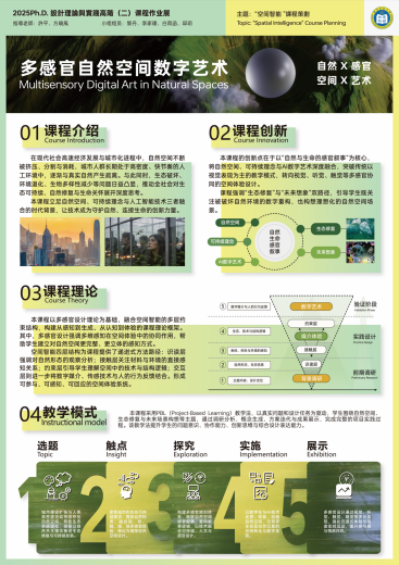 本组聚焦于现代城市化进程中自然与生命的疏离问题,以“自然生命感官叙事”为核心,构建了从感知到体验的跨媒介数字艺术课程框架。课题深度内化了“多层约束”理论,将识读层对应自然形态,接触层对应媒介体验,约束层对应技术逻辑,交互层对应行为反馈,通过AI工具驱动多感官联觉设计,实现了数字艺术从纯视觉表现向“生态修复”与“未来想象”双向路径的跨越。