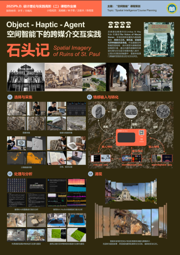 该课题建立在“Object(物性识读)- Haptic(具身感知)- Agent(智能代理)”的三角逻辑架构之上,将澳门大三巴及周边的物理遗迹重构为具备叙事能力的具身智能体。课题通过对石材肌理等“物性线索”的深度识读,利用传感器反馈媒介将物理接触转化为感官认知,并在多层约束的系统驱动下,使沉默的石头在与人的交互中涌现出跨越时空的城市历史记忆与“空间意象”。