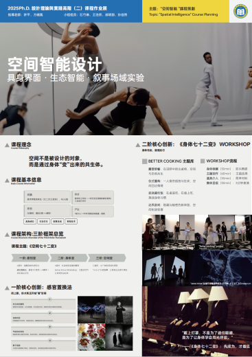 课题以“空间七十二变”为主题,主张“身体先动,道理后行”,通过舞蹈艺术与感官置换实验,探讨空间作为身体延伸的共生逻辑。课题展现了极高的艺术实验性,通过“感官置换”与“身体变”等高强度工作坊,打破了空间的被动客体地位,实现了从传统物理测绘向基于“身体签名”驱动的叙事性场域生成的颠覆式跃迁。