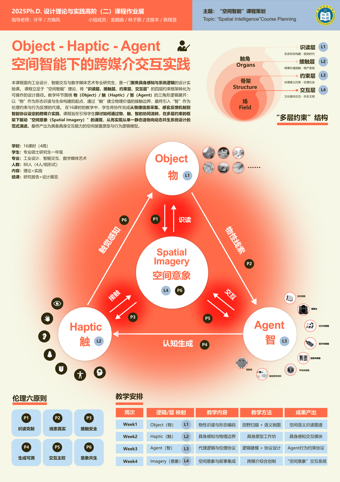 課題聚焦於從“空間感知”到“實體響應”的邏輯升級,通過P-U-R-E-E框架探討多主體協同下的五感融合交互。亮點在於其對“物”之邊界的重新定義,將AI視為感性體驗的擴展工具,特別關注盲人與老年群體的包容性需求,構建了一套將多感官體驗轉化為具體實體響應的設計評價矩陣。