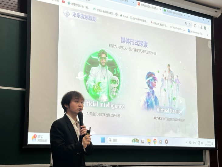 講座伊始,楊少夢總監以「數智時代的音樂回響」為主題,系統回顧了網龍網絡公司與澳科大在產學研方面的合作成果。依託數字創新與人文教育研究中心,雙方在EDA微認證職業課程共建、AIGC短片創意大賽等活動中取得了顯著進展。此外,講座亦展示了超寫實AI數字人在智慧校園中的應用探索,包括引入AI數字人語音交互程序(ChatMUST),為智慧校園建設提供了新的思路。