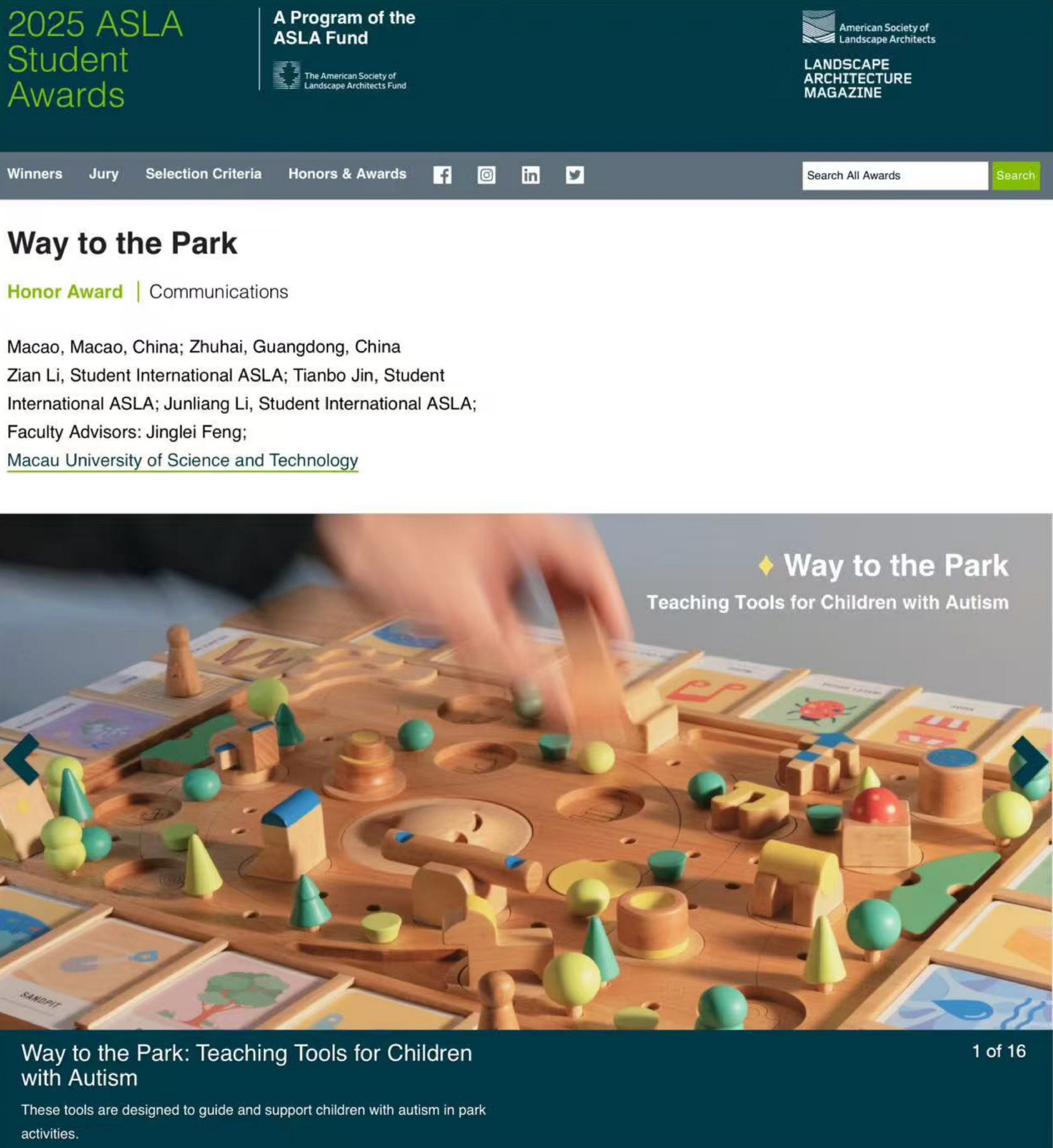 澳門科技大學人文藝術學院李子安、金天博和李俊良三位同學共同完成的設計項目「Way to the Park」,在馮晶磊老師的指導下榮獲2025年度美國景觀設計師協會(ASLA)學生榮譽獎,並獲《Land...