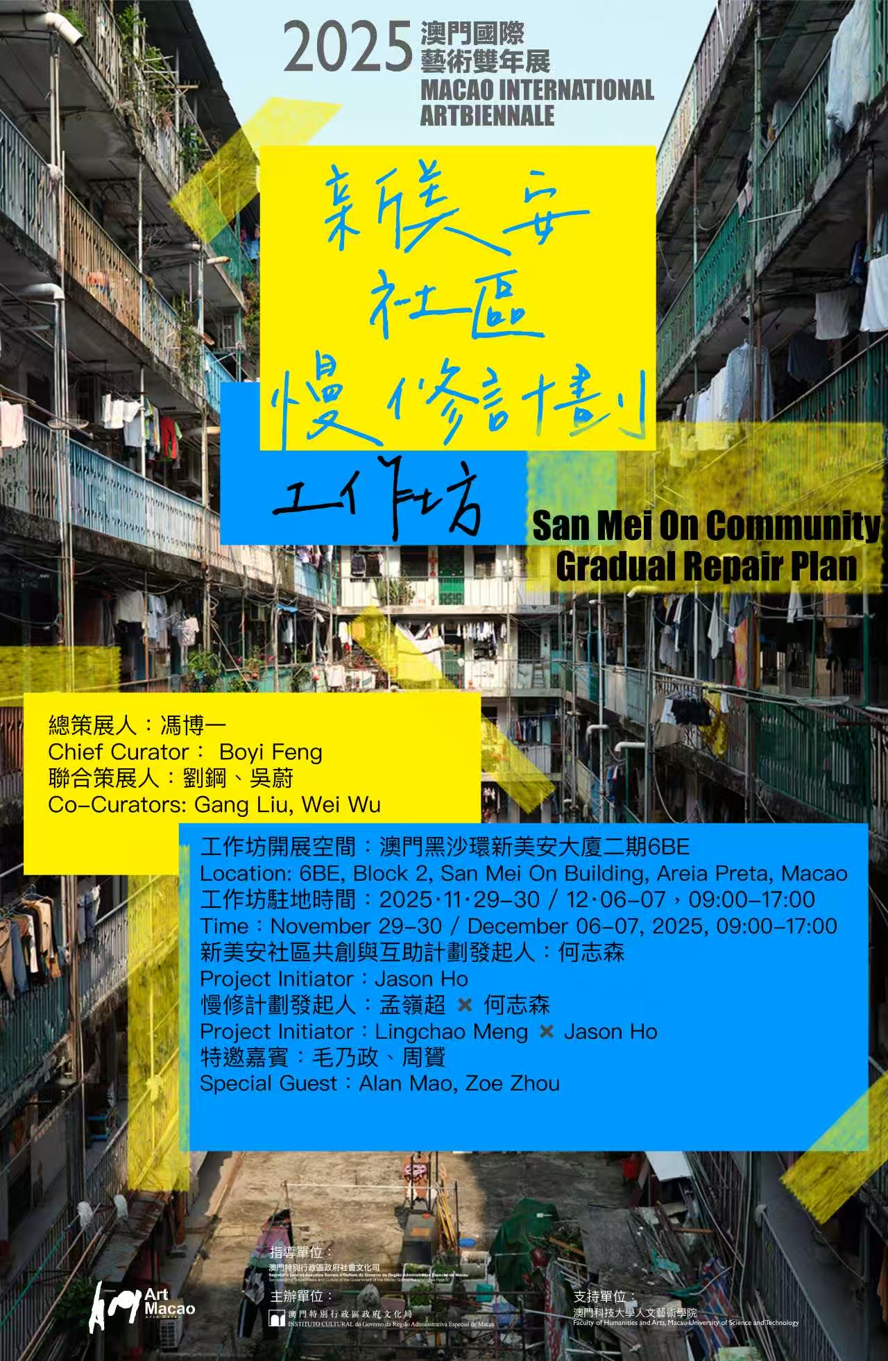 由澳門科技大學人文藝術學院孟嶺超助理教授聯合華南理工大學建築學院何志森副教授共同發起的“新美安社區慢修計劃工作坊”,于11月28日至12月6日在澳門新美安大廈二期順利開展,該工作坊屬於“2025藝文薈...