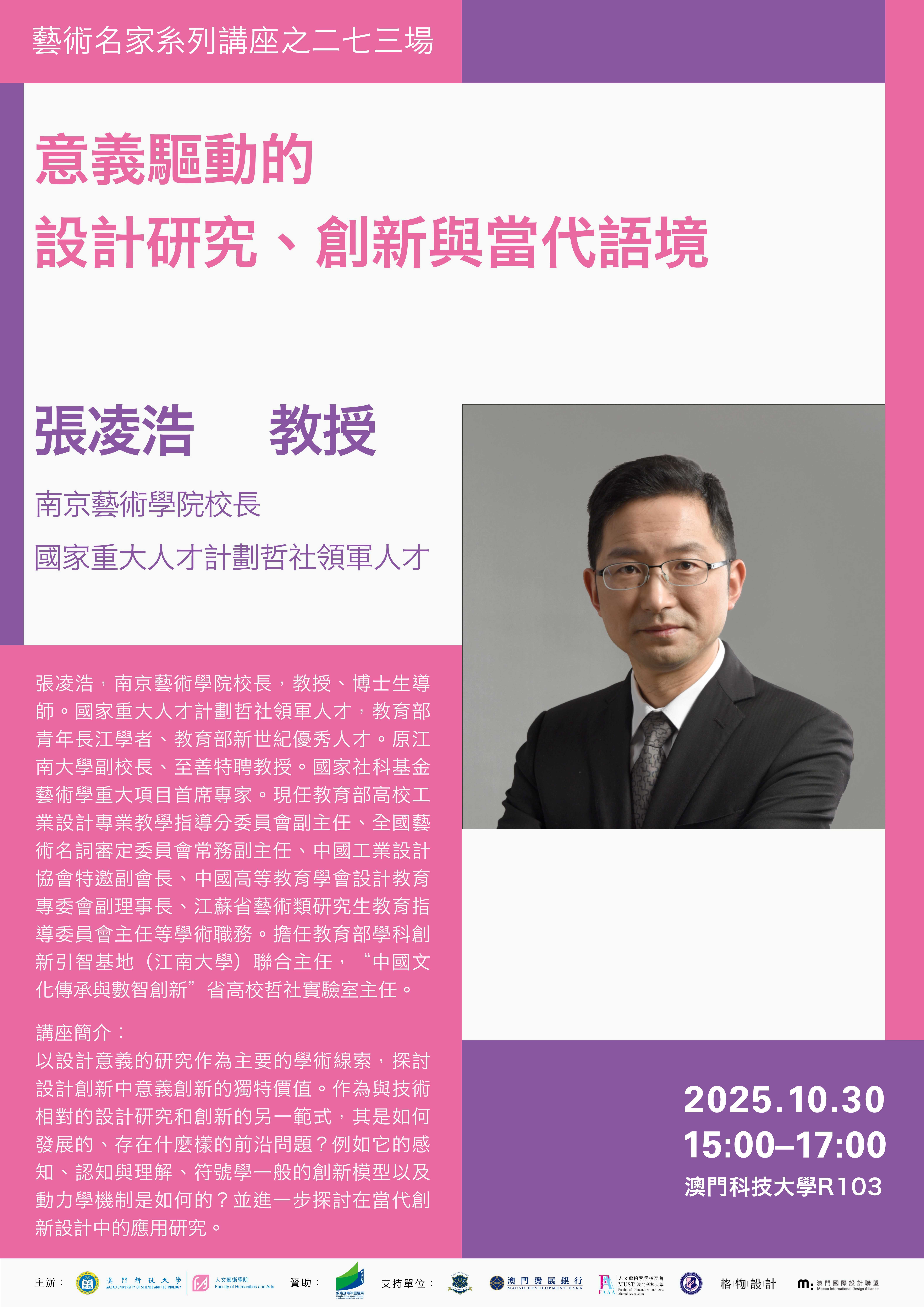 講題:意義驅動的設計研究、創新與當代語境講者:張凌浩教授日期:2025年10月30日時間:15:00-17:00地點:澳門科技大學R103