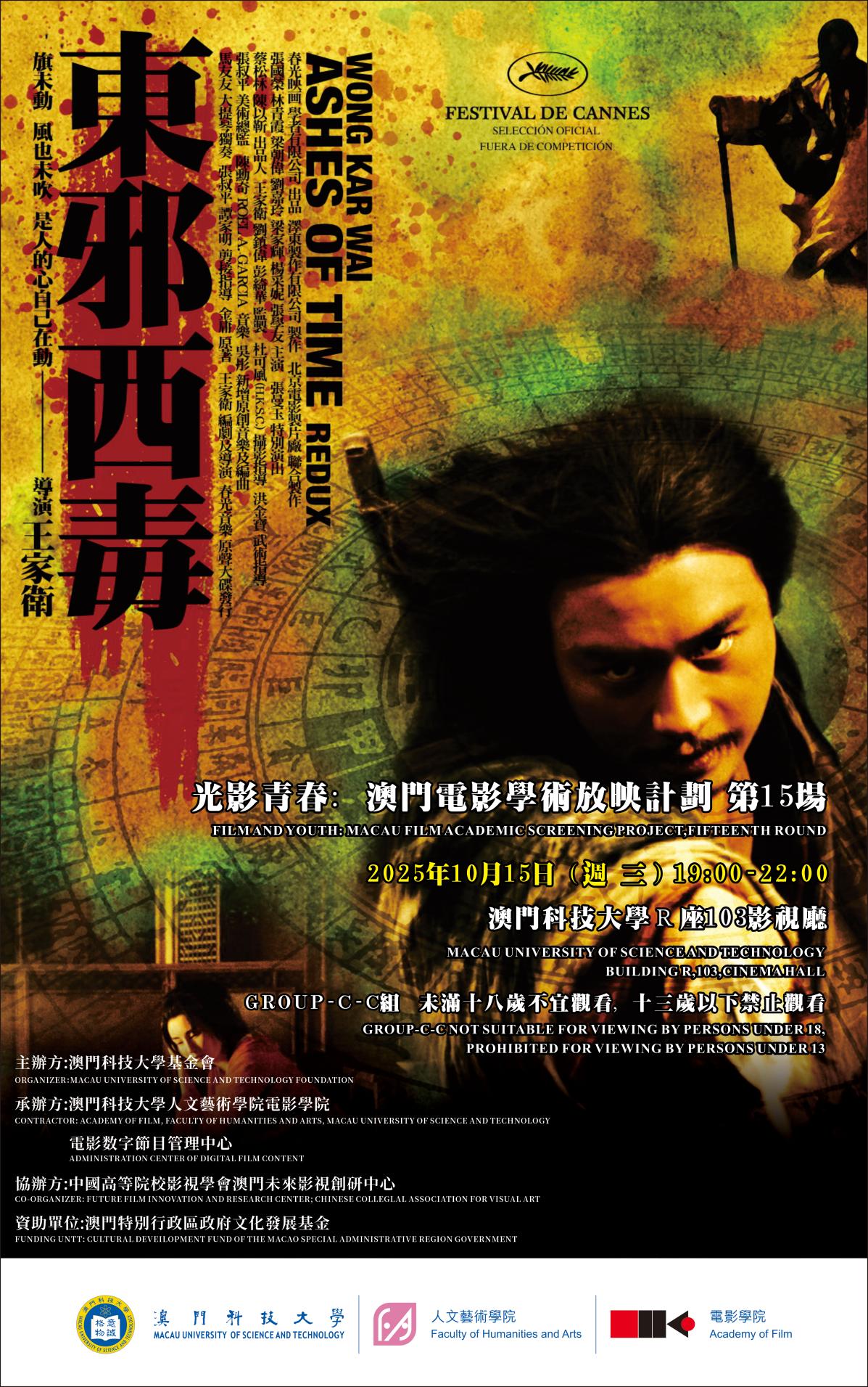 由澳门科技大学基金会主办、澳门科技大学人文艺术学院电影学院与电影数字节目管理中心承办、中国高校影视学会澳门未来影视创研中心协办、澳门特别行政区政府文化发展基金资助的“光影青春:澳门电影学术放映计划”第15场将于2025年10月15日晚上七点在R座103影视厅举办。此次活动将展映经典电影《东邪西毒》。