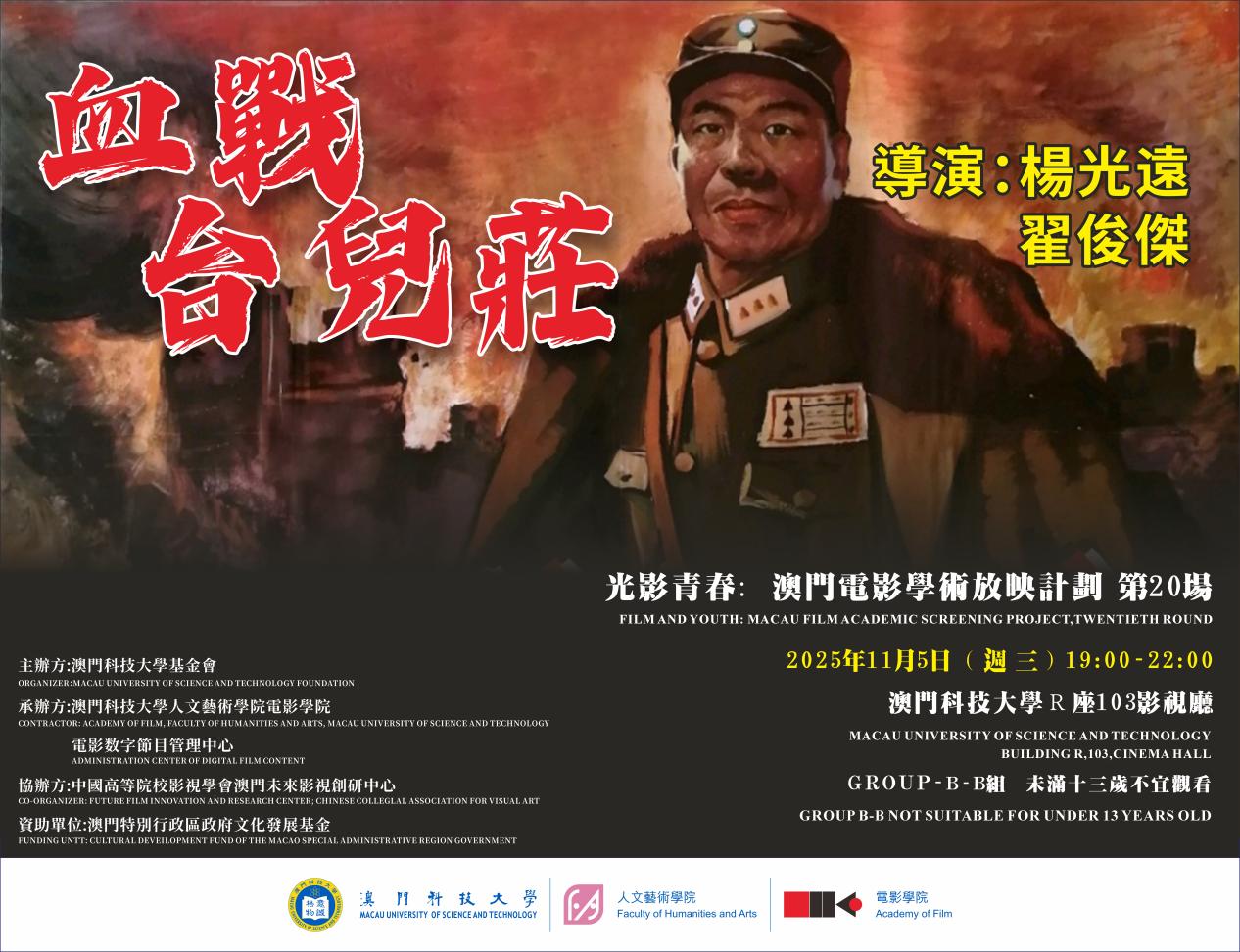 由澳门科技大学基金会主办、澳门科技大学人文艺术学院电影学院与电影数字节目管理中心承办、中国高校影视学会澳门未来影视创研中心协办、澳门特别行政区政府文化发展基金资助的“光影青春:澳门电影学术放映计划”第20场将于2025年11月5日晚上七点在R座103影视厅举办。此次活动将展映经典电影《血战台儿庄》。